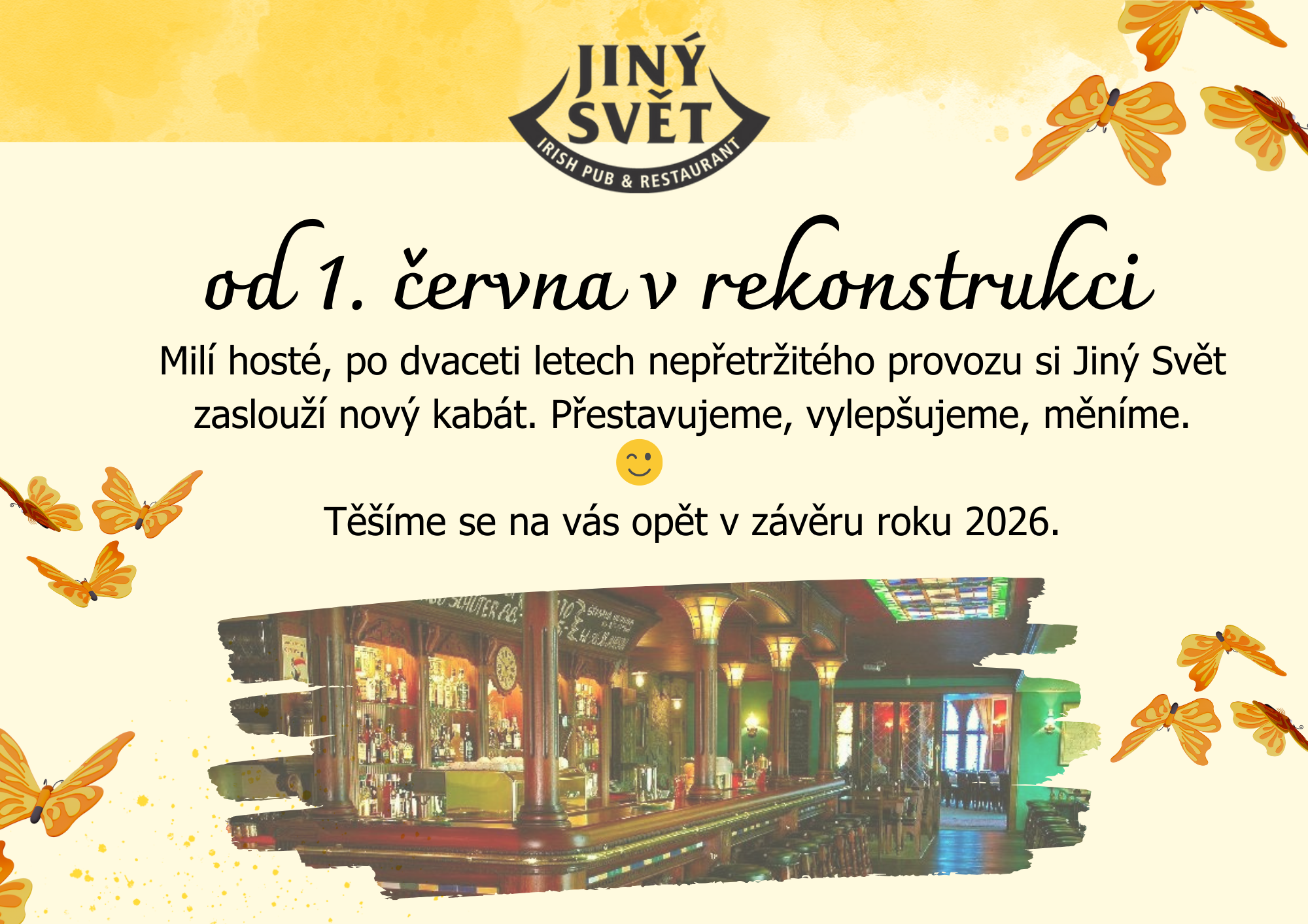 Milí hosté, po dvaceti letech nepřetržitého provozu si restaurace Jiný svět zaslouží revitalizaci. Od 1. června proto je uzavřena a hosté dostanou přehled okolních restaurací k dispozici. Naštěstí je jich dostatečný počet. :) Kolegové se na vás budou opět těšit závěru roku 2026.